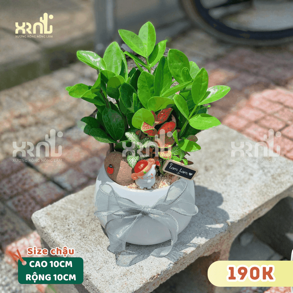 Mô tả: Chậu cây để bàn Kim tiền xinh sắn hút tài lộc may mắn, chậu có kèm phụ kiện và thắt nơ