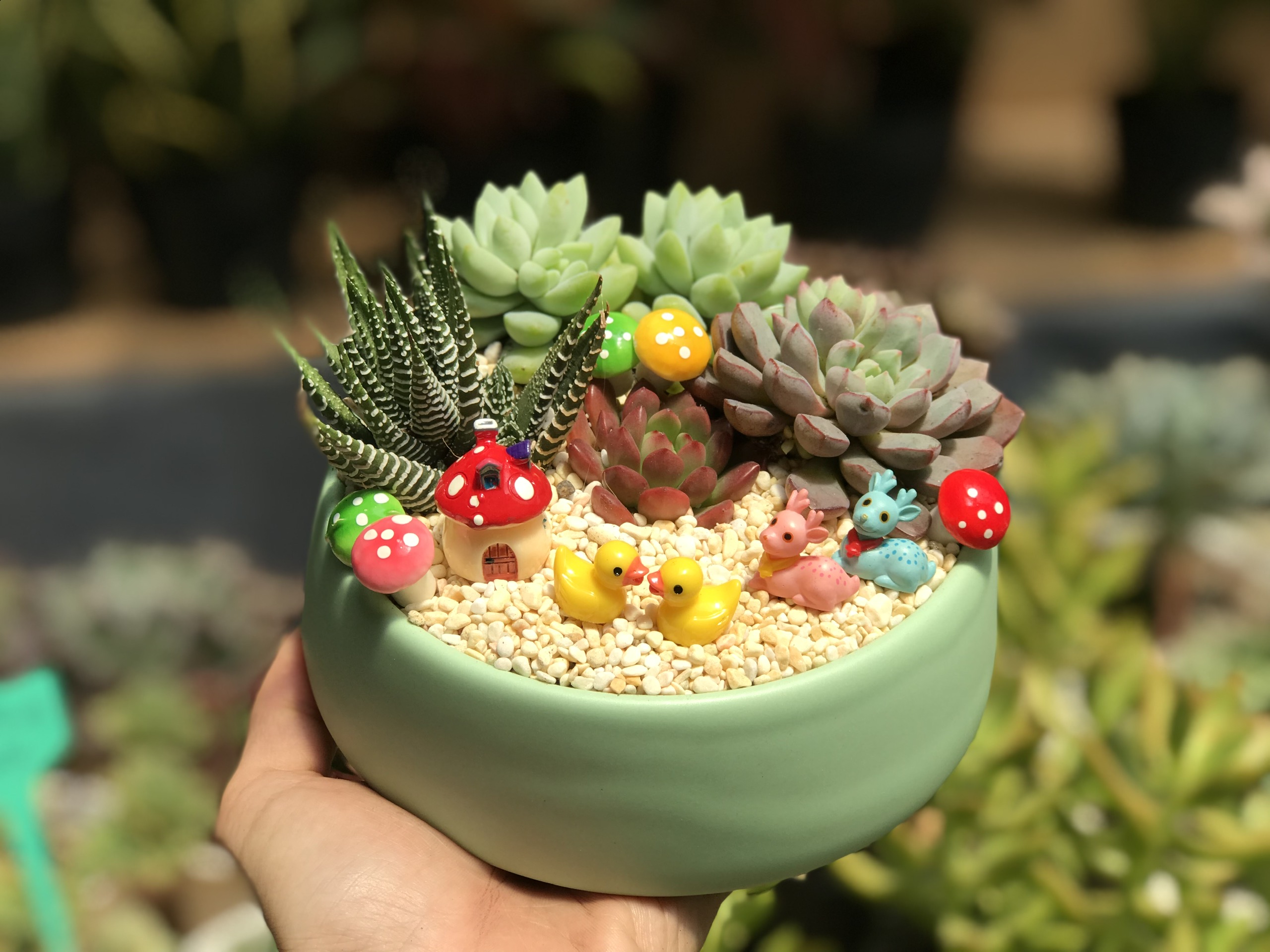 Sen Đá Nông Lâm có bán đầy đủ cây, chậu, phụ kiện để bạn có thể sáng tạo một chậu sen đá xinh xắn và các mẫu tiểu cảnh phối sẵn bắt mắt dành tặng cho chính mình hoặc bạn bè.